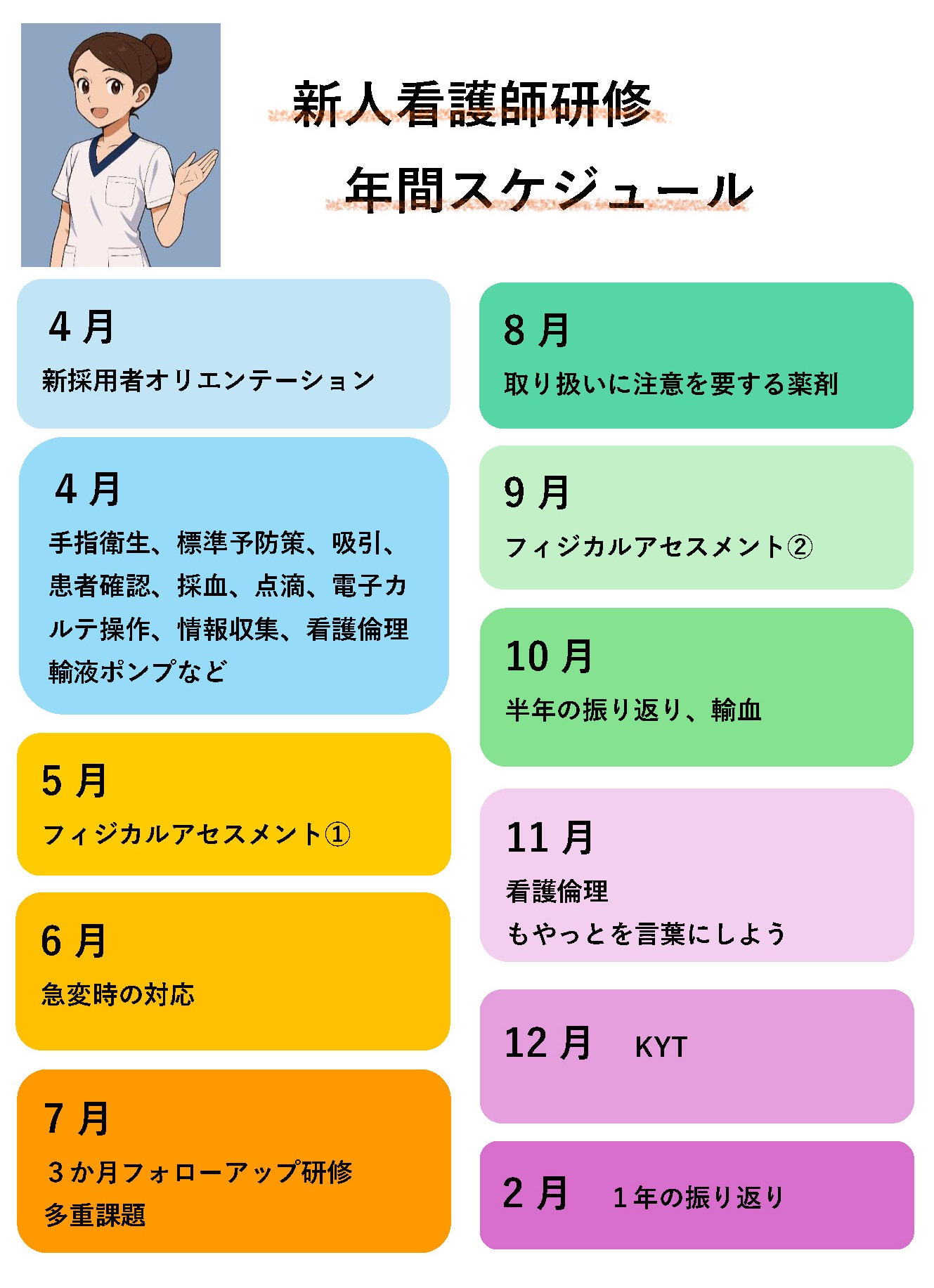 看護部の教育理念に基づき、院内教育プログラムの作成、新人看護師研修、クリニカルラダー別研修の企画、実施、評価などを行っています。