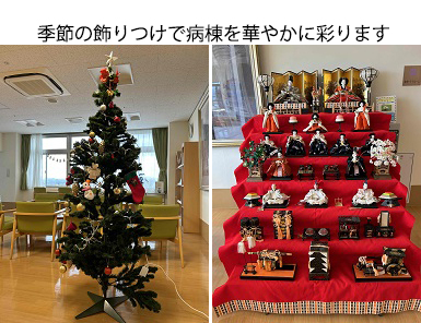 私たちは患者さん一人ひとりの思いを尊重し、『その人らしい』穏やかな暮らしを支えることを大切にしています。外出・外泊や、病棟内で季節のイベント等を行い、患者さんとご家族で過ごせるように、また、